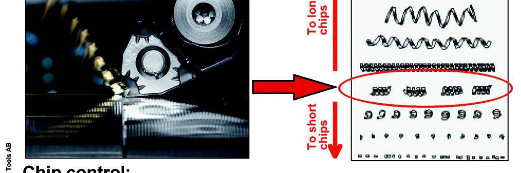 Another very important factor is the ratio between depth of cut and feed to achieve well-shaped chips, i.e. chips that are not too long, and not too short. The ratio of depth of cut to feed should also be within certain limits. Based on empirical measurements for long chipping materials, the ratio of depth of cut to feed should be somewhere between five and 15.